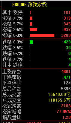 市场共4801只个股上涨,101只个股涨停,471只个股下跌。