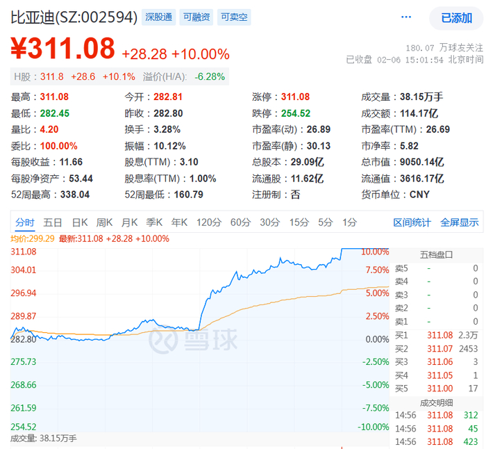 2月6日,午后比亚迪的股价直线拉升,临近尾盘涨停,成交额超100亿元,总市值超9000亿元。