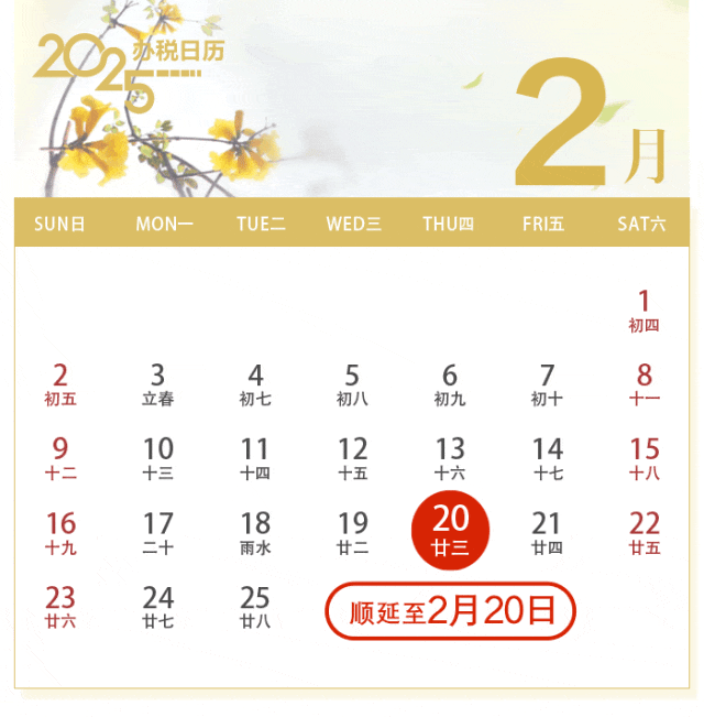 2025年2月申报纳税期限顺延至2月20日,提醒大家合理安排申报时间,错峰完成申报!