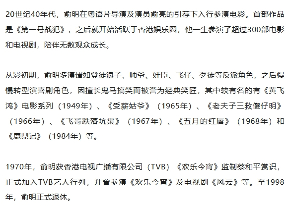 “香港经典粤语片笑匠”俞明4日去世,享年100岁。俞明的女儿在社交平台发文称:“年初七早上,爸爸睡梦中安详离世,永远怀念。”