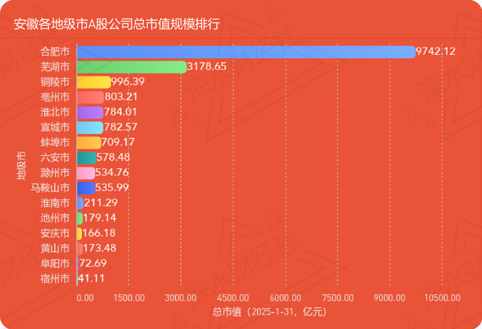 在市值区域分布方面,截至1月31日,合肥市A股公司总市值达到9742.12亿,位居省内第一位;芜湖市以3178.65亿位居第二;铜陵市以996.39亿位居第三;亳州以803.21亿位居第四;淮北市以784.01亿位居第五。