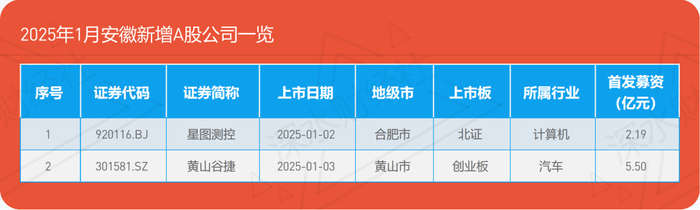 1月份安徽新增的两家公司分别位于合肥市和黄山市,分别是星图测控(920116)和黄山谷捷(301581)。