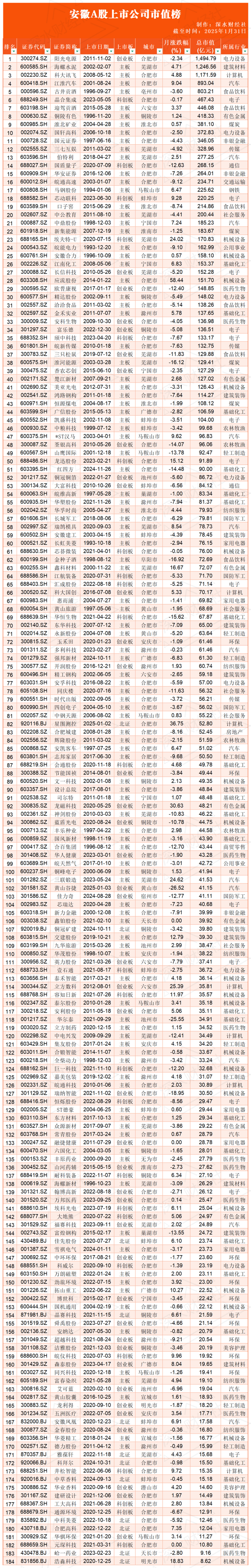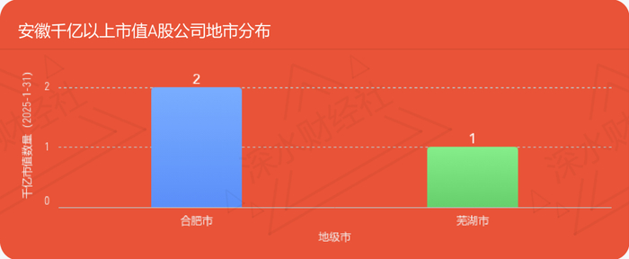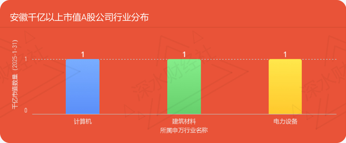 截至1月31日,安徽A股公司有3家公司市值突破千亿,位居国内第九位,其中合肥有2家,芜湖市有1家,这三家公司分别是阳光电源、海螺水泥、科大讯飞。
