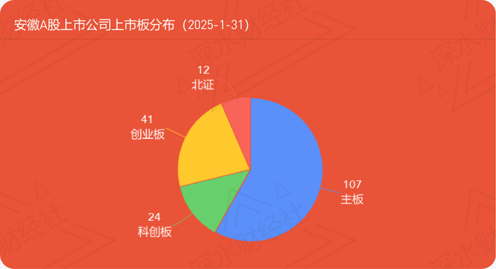 在板块分布方面,安徽A股公司共有主板公司107家,创业板公司41家,科创板公司24家,北交所公司12家。其中科创板公司数量位居国内第六位。