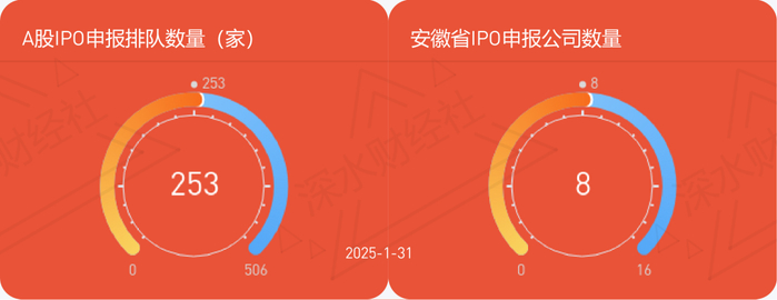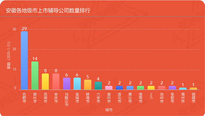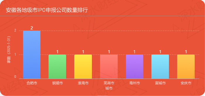 在IPO排队公司数量方面,截至1月31日,安徽共有8家公司处于申报排队,数量位居国内第九位,其中合肥有2家,铜陵、淮南、芜湖、亳州、宣城、安庆各有1家。