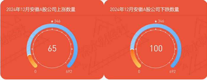 2025年1月,安徽有65家A股公司股价上涨,有100家A股公司股价下跌。