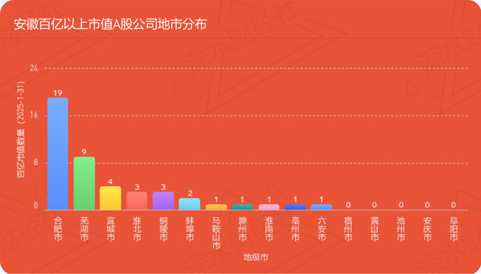 截至1月31日,安徽A股公司共有45家公司市值超过百亿,位居国内第九位,其中合肥以19家位居第一,芜湖以9家位居第二,宣城以4家位居第三,淮北和铜陵各有3家,蚌埠有1家,马鞍山、滁州、淮南、亳州、六安各有1家。