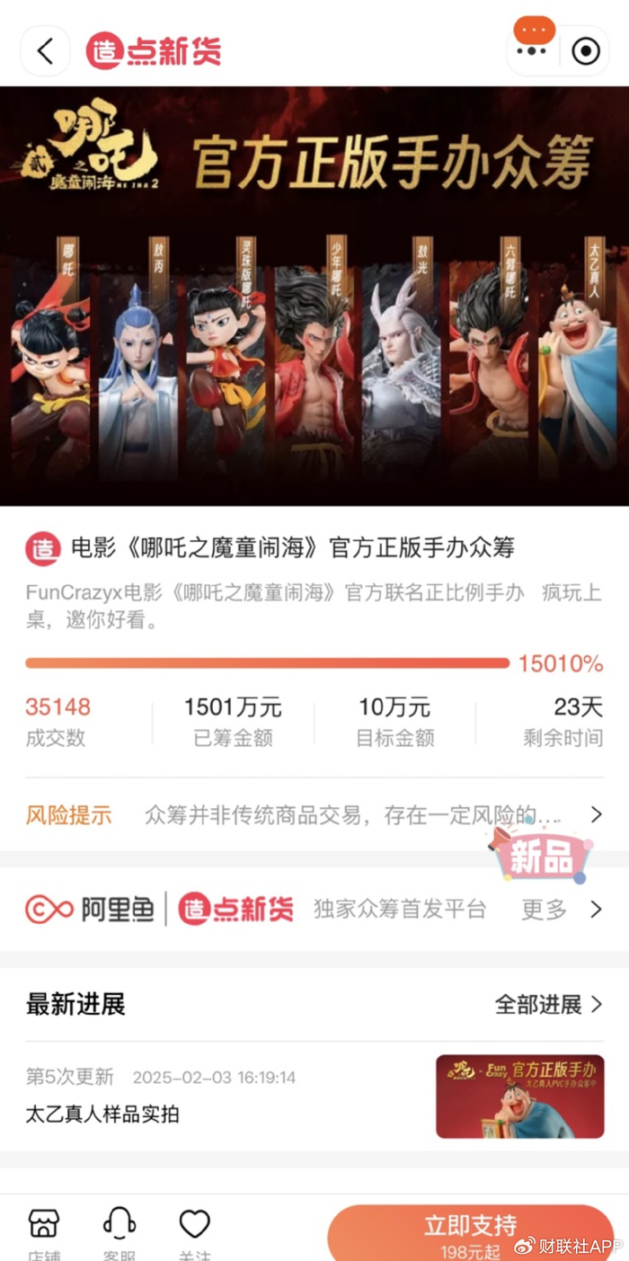 本次众筹速度相较2019年《哪吒之魔童降世》提升超100%,并连续两日登上淘宝热搜榜,最高冲至TOP2,成为春节档周边市场的“黑马”。目前,众筹仍在火爆进行中。