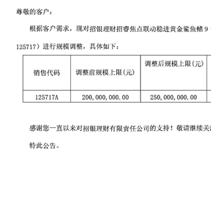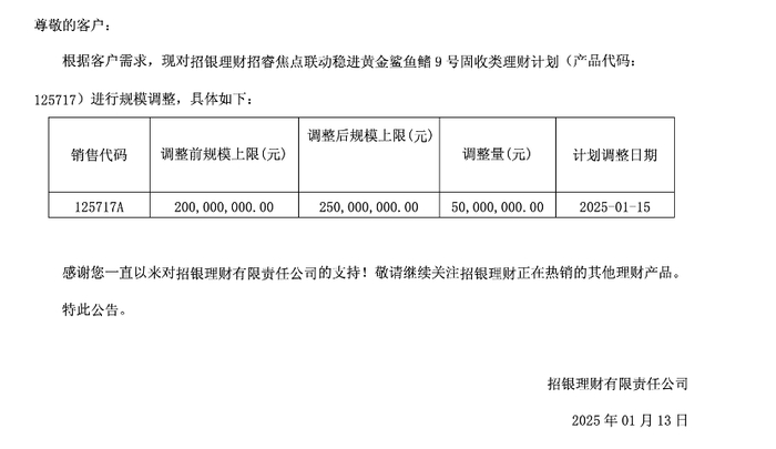 例如,近日招银理财发布公告称,根据客户需求,将“招睿焦点联动稳进黄金鲨鱼鳍9号固收类理财计划”的发行规模上限,由2亿元上调至2.5亿元。该产品目前已完成募集。
