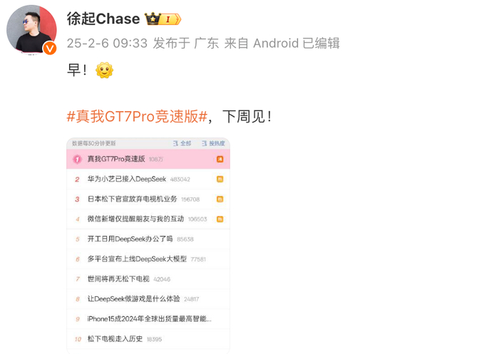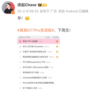 如上图所见,真我realme副总裁、全球营销总裁、中国区总裁徐起宣布真我GT7 Pro竞速版下周见。