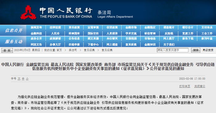 2月6日,中国人民银行等6部门发布关于《关于规范供应链金融业务引导供应链信息服务机构更好服务中小企业融资有关事宜的通知(征求意见稿)》公开征求意见的通知。意见反馈截止时间为:2025年3月8日。