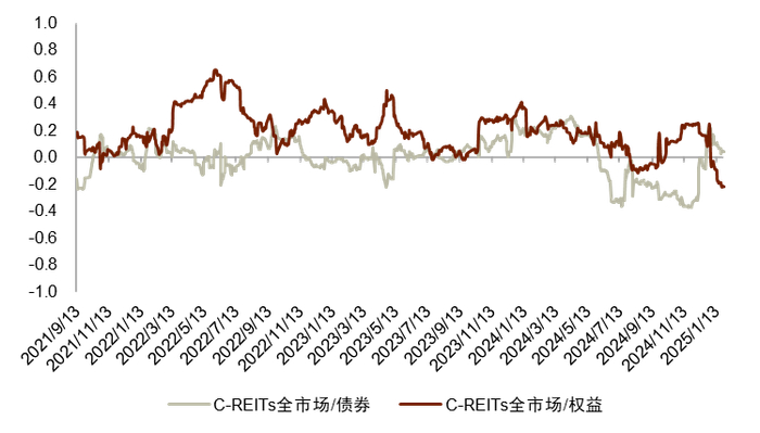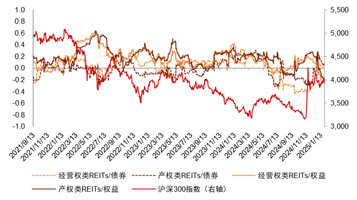 注:1)REITs与债券及权益的关系分别采用中债综合全价指数、沪深300指数计算;2)数据截至2025年1月27日