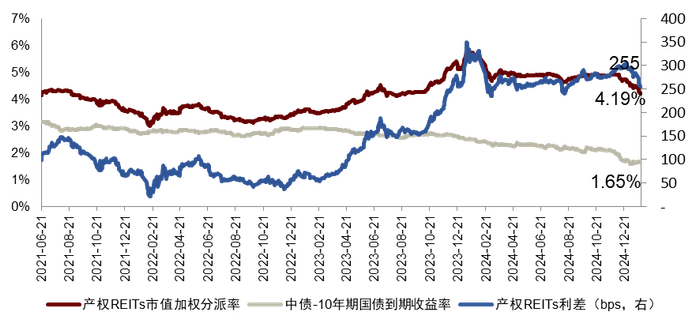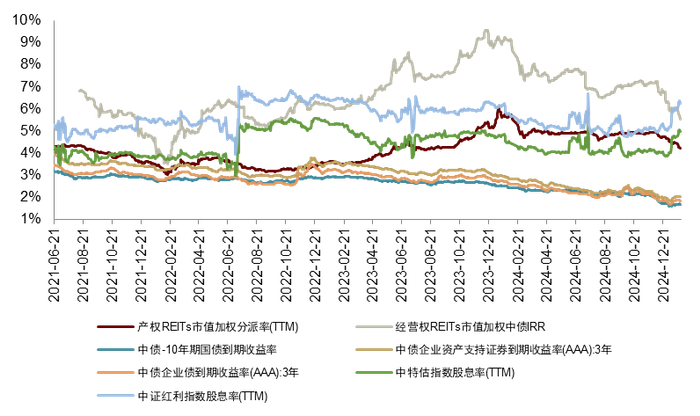 注:1)数据截至2025年1月27日;2)2025年年度管理人预期可供分派率基于各REITs招募书中的管理人预测2025年度可供分配金额年化计算;24Q4YTD实际可供分派率基于各REITs2024年四季报披露的本年累计可供分配金额计算,未年化;年化可供分派率(近4个季度实际或管理人2024年预期)的计算中,有历史季报的REITs基于各REITs24Q1至24Q4累计可供分配金额(为缓解期初现金影响,第一次季报报告期之前产生的可供分配金额未纳入计算)计算,没有历史季报的REITs按招募书中的管理人预测2025年度可供分配金额计算,均按天数年化;C-REITs全市场、产权类REITs及经营权类REITs分派率采用总市值加权法计算;3)未发布2024年中报的REITs采用拟募集金额测算NAV,已发布2024年中报的产权REITs项目的NAV测算方式为(期末基金净资产+资产评估公允价值-投资性房地产-等同于发行溢价部分的商誉(如有))/发行份额,除华泰江苏交控REIT以其2024年中报披露的期末基金份额公允价值参考净值计算外,已发布2024年中报的经营权REITs项目的NAV均以账面净资产价值计算;4)NAV均剔除分红