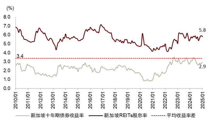 图表43:新加坡REITs股息率与新加坡政府十年期债券收益率对比