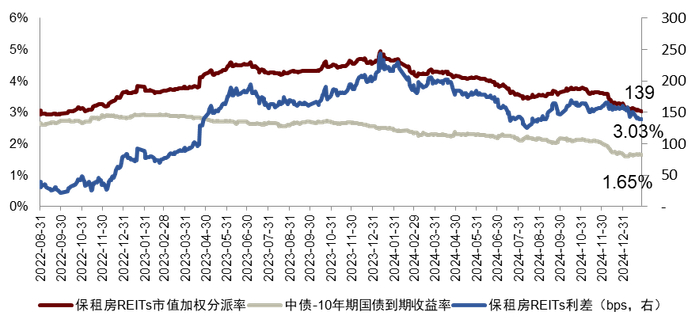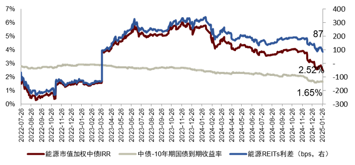 市场持续上行后,估值进一步推高。我们统计1月底各板块与十年期国债利差/利差全历史分位数/利差24年至今分位数分别为118bps/45%/10%(市政环保)、531bps/49%/0%(高速公路)、87bps/27%/0%(能源)、321bps/90%/67%(仓储物流)、272bps/80%/36%(产业园)、139bps/30%/7%(保租房)、252bps/0%/0%(消费)。