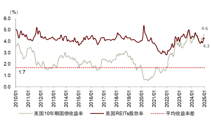 图表37:美国REITs股息率与美国十年期国债收益率对比