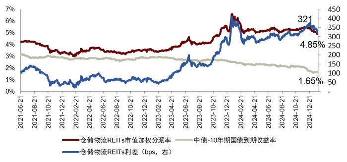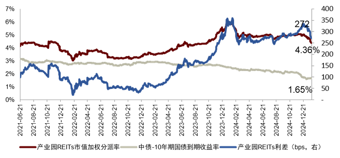 注:1)分派率(TTM)= 最近4个季报披露的单位可供分配金额之和除以市值,少于4个季报的项目的可供分配金额按天数年化;2)新上市项目从第一个季报发布日期起纳入计算;3)数据截至2025年1月27日;4)中债IRR数据起始日为2021年8月13日