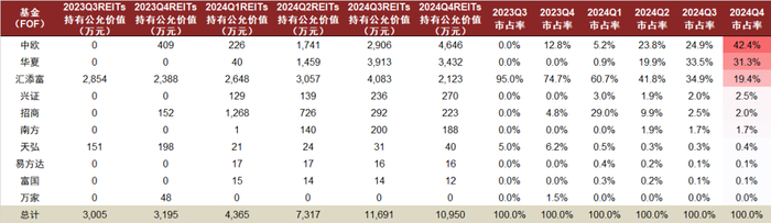 公募FOF基金24Q4边际减仓REITs。截至24Q4,公募FOF基金持仓REITs规模约为1.095亿元,环比下降6.3%,Top5持仓标的分别为中交、首创水务、普洛斯、东吴苏园、广州广河。有REITs持仓的公募FOF产品数量为43只,环比下降2只。基金公司数量维持在9家,中欧、华夏、汇添富3大基金市占率达93.2%,其中中欧加仓,市占率升至第一,华夏和汇添富减仓。获得边际净买入的REITs主要包括东久、普洛斯、厦门安居、蛇口产园、安徽交控,基本为各子板块内分派率中等或偏高的标的。