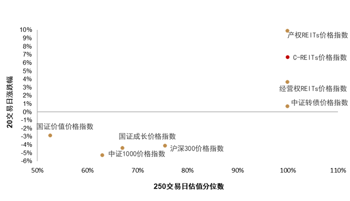 注:1)数据截至2025年1月27日;2)C-REITs估值为市值加权P/NAV,股指估值为P/E(TTM),可转债估值为百元溢价率