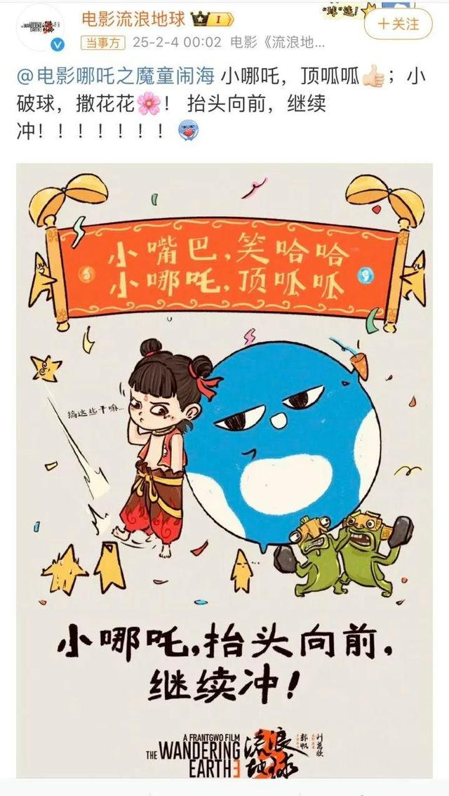 电影《长津湖》发出祝福海报,祝贺哪吒登顶,“笃行致远的中国电影,一起加油”!