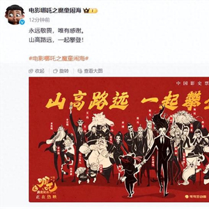 电影《哪吒之魔童闹海》官博发布全家福海报回应登顶,并配文称:“永远敬畏,唯有感谢。山高路远,一起攀登!”