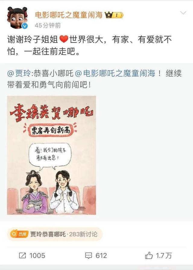 《你好,李焕英》导演贾玲更在线恭喜小哪吒,“电影《哪吒之魔童闹海》,继续带着爱和勇气向前闯吧!”《哪吒之魔童闹海》也暖心回复道,“世界很大,有家、有爱就不怕,一起往前走吧。”
