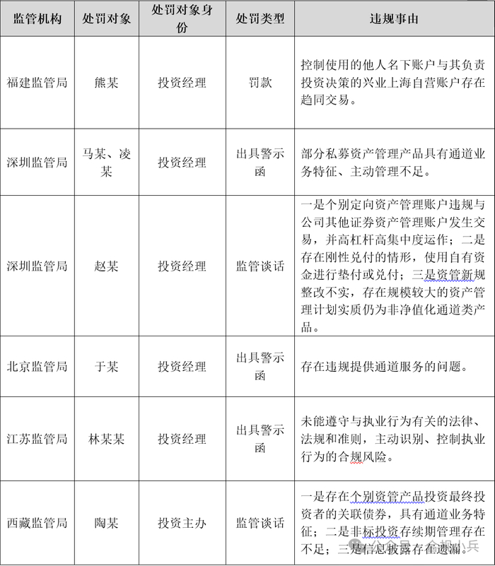 2024年,投资经理人涉及处罚案例6个,处罚事由主要分为三类,包括违规提供通道服务(4例涉及),投资交易管理不规范(3例涉及),违规刚性兑付(1例涉及)。