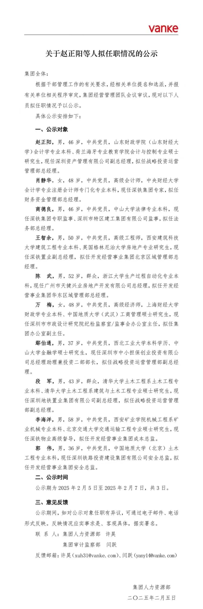 而在2月5日更早时间,万科发布拟任职公示,这些人员均来自深圳国资系统。拟出任集团战投、财务部、法务部、北京区域、华东区域区等多个关键岗位。