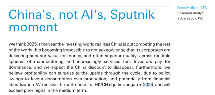 2月5日(周三),德意志银行(下称“德银”)分析师Peter Milliken在题为《中国的,而不是AI的,斯普特尼克时刻》(China‘s, not AI’s, Sputnik moment)的研报中称,全球投资者今年将意识到中国制造业和服务业的竞争力优势。DeepSeek的发布更像是中国的“斯普特尼克”时刻(注:指迎来变革和进步的重要契机),预计中国股票“估值折价”将消失。