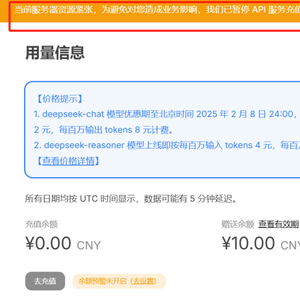 对此,DeepSeek官网声明称,“当前服务器资源紧张,为避免对您造成业务影响,我们已暂停API服务充值。存量充值金额可继续调用,敬请谅解!”