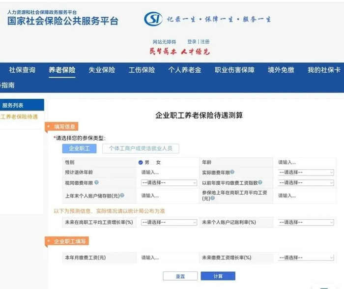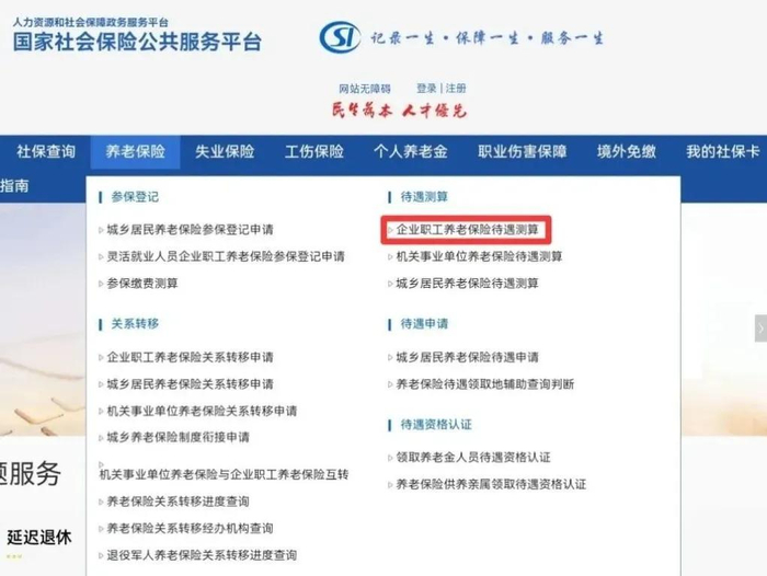 第一步:登录“国家社会保险公共服务平台”,找到“养老保险——企业职工养老保险待遇测算”。