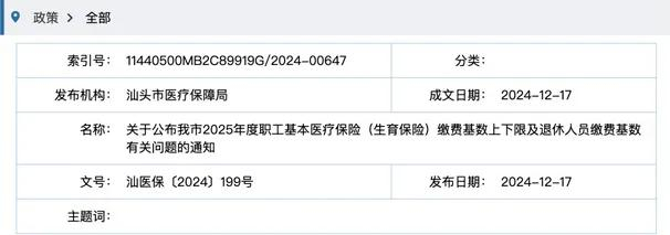 汕头市医保局此前发布《关于公布我市2025年度职工基本医疗保险(生育保险)缴费基数上下限及退休人员缴费基数有关问题的通知》。该通知自2025年1月1日起执行。