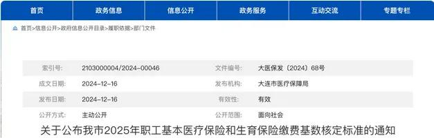 大连市医保局近期发布《关于公布我市2025年职工基本医疗保险和生育保险缴费基数核定标准的通知》,自2025年1月1日起执行。