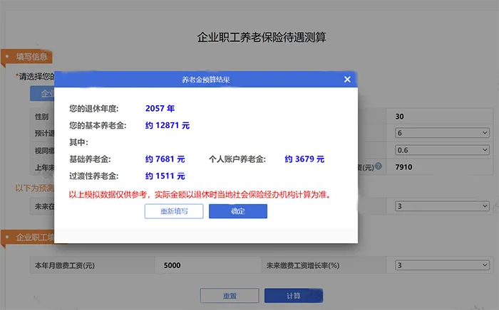 (注:这个计算器,只是根据假设数据,推算出最终退休金。实际情况,可能和推算的会有差别,而且,每个人的养老金根据当地工资水平、缴费年限、缴费档次的不同而不一样。因此,仅供参考。)