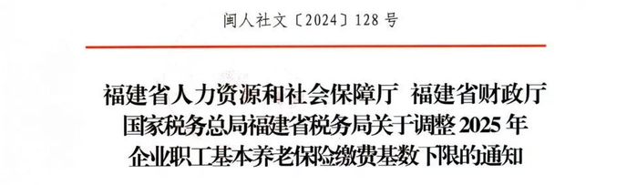 2024年12月初,福建省人力资源和社会保障厅发布《关于调整2025年企业职工基本养老保险缴费基数下限的通知》,该通知自2025年1月1日起执行。