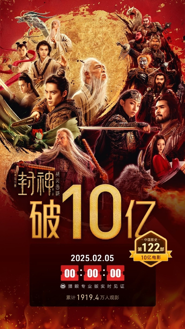 1月29日大年初一,神话史诗电影《封神第二部:战火西岐》正式上映,据猫眼专业版数据,截至2月5日0点,电影《封神第二部:战火西岐》 上映8天, 总票房破10亿。