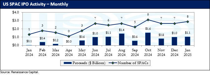 整个一月份的所有IPO平均回报率为44%,这主要受到一只波动较大的中国微型股的推动。股市在1月内波动不定,受到财报、通胀数据以及人工智能领域发展的影响。文艺复兴IPO指数表现强劲,上涨了8%,远超标普500指数的涨幅(+3%)。IPO管道活动令人鼓舞,多个大型发行人提交了新的申请和更新,涵盖了多个行业和业务领域。新的空白支票公司发行进一步增加,去SPAC活动保持稳定。一月份有8家空白支票公司上市,10家加入了IPO管道,同时完成了4家合并交易并宣布了5家。尽管存在一些波动,2025年IPO市场开局良好,尽管二月份可能会因公司等待年终财务数据而出现短暂停顿,但交易流量预计将在未来几个月继续增加。