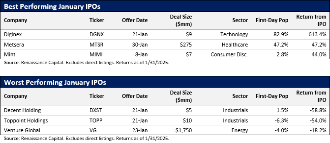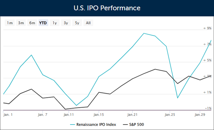 IPO指数(IPOUSA),即文艺复兴IPO ETF(纽约证券交易所代码:IPO)的基础指数,在一月份上涨了7.7%,大幅超过了标普500指数2.8%的回报率。市场经历了波动,初期因强劲的盈利和通胀数据从低迷中反弹,随后因对中国深度求索人工智能(DeepSeek AI)的担忧而短暂回落。IPO指数旨在持有过去三年内美国最大且流动性最强的IPO公司组合,其前几大持仓包括Arm Holdings、Kenvue、Astera Labs、CAVA Group以及Credo Technology Group Holding。