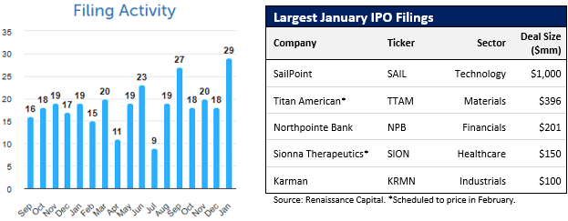 一月份,29家公司提交了首次公开募股(IPO)的初步申请文件,这一数字较前一个月(18家)有所增加,并且高于一月份的10年平均值(17家)。大规模的新申请达到了三年来的最高点,有13家发行人提交了申请,计划筹集1亿美元或更多资金。截至月底,IPO排队企业数量达到185家,计划筹集约90亿美元,其中包括115家在过去90天内提交或更新申请的“活跃排队企业”,其中15家预计将筹集至少1亿美元。