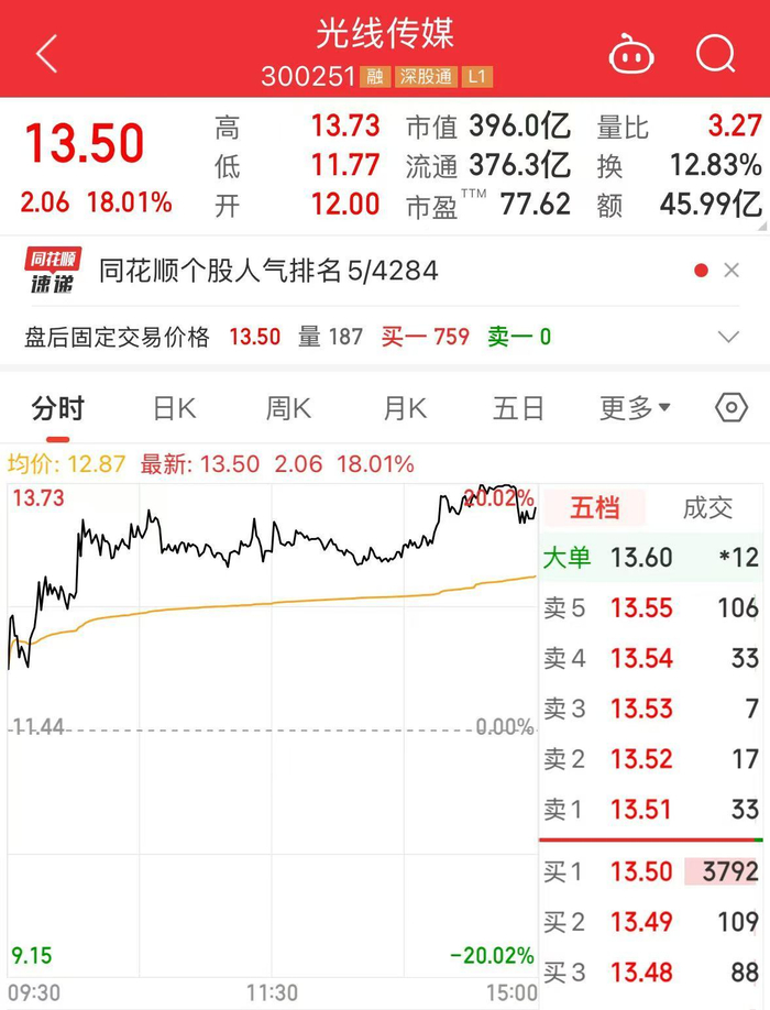 2月6日,光线传媒(300251.SZ)尾盘触及20%涨停,股价创近4年新高。截至收盘,股价报13.5元,上涨18.01%,成交额近46亿。2月5日至6日两天时间,光线传媒市值已累计增长约116亿元。