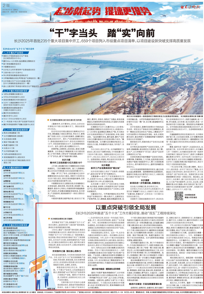 2月6日,锚定“三高四新”美好蓝图、推进长沙高质量发展大会召开,现场印发《长沙市2025年推进“五个十大”工作方案》,以一批投资量大、标志性强、带动力好的项目推动“双五”工程持续深化,全方位扩大内需,加快构建现代化产业体系,全力建设全球研发中心城市,提升特大城市功能品质,提高人民生活水平,以重点突破牵引带动全局发展。