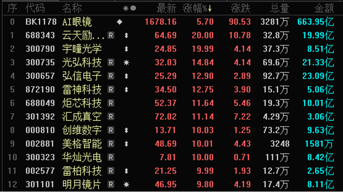2月6日,AI眼镜概念股走强,云天励飞-U、宇瞳光学“20cm”涨停,光弘科技、弘信电子、雷神科技、炬芯科技、汇成真空均涨超10%,创维数字、雷柏科技、美格智能等多股涨停。