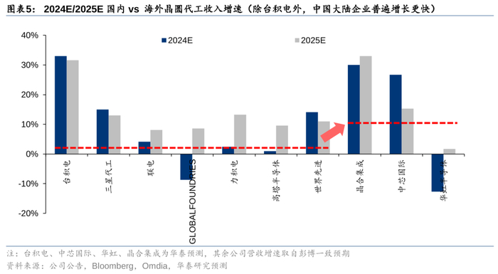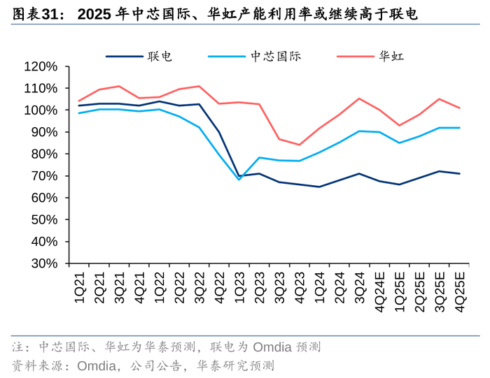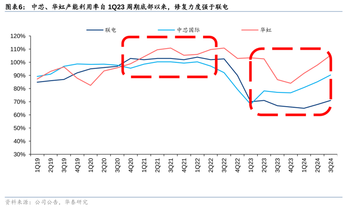 因此,我们看到中国代工企业在2023年的行业下行周期中业绩表现更具韧性的同时,2024年的产能利用率和营收修复力度普遍强于全球成熟制程代工同业。根据Trendforce,中芯国际自1Q24以来,已超过联电和格罗方德稳居全球第三大代工企业的地位。3Q24中芯国际及华虹的产能利用率分别为90%和105%,而联电的产能利用率为71%。我们认为在国内外客户在地化生产的推动下,2025年国内代工企业营收增长有望继续超过全球成熟制程同业。