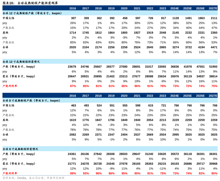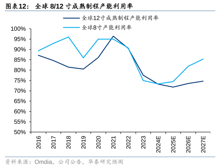12英寸:供需结构性分化,28nm预计满载,但40-90nm预计将过剩。Omdia预计全球纯晶圆代工市场规模(除台积电外,成熟制程市场)将从2023年的322.57亿美元增长至2027年的472.71亿美元,对应CAGR为10.0%。全球主要半导体产品将逐步从8英寸转移到12英寸平台,因此我们预计2024-2027年全球12英寸成熟制程需求增长将保持10.9%的CAGR。根据Omdia及我们统计,海外代工企业扩产相对保守,中国主要晶圆代工企业正积极推动12英寸成熟制程产能建设,2024-2027年中国大陆和海外12寸成熟产能扩张CAGR分别为26.8%和3.6%,全球综合产能增速CAGR为12.0%。典型的项目包括中芯国际京城、深圳、临港和西青厂、华虹无锡12英寸项目二期、晶合集成N3厂、燕东微12英寸项目二期等。由于未来需求和供给增速基本匹配,我们预计2024-2027年全球12英寸成熟制程产能利用率或保持在73%-75%左右的水平,整体呈现产能过剩状态。其中,28nm由于竞争者相对较少和市场增长迅速,将保持满载状态,但40/55/65/90nm节点竞争激烈或将呈现过剩状态。