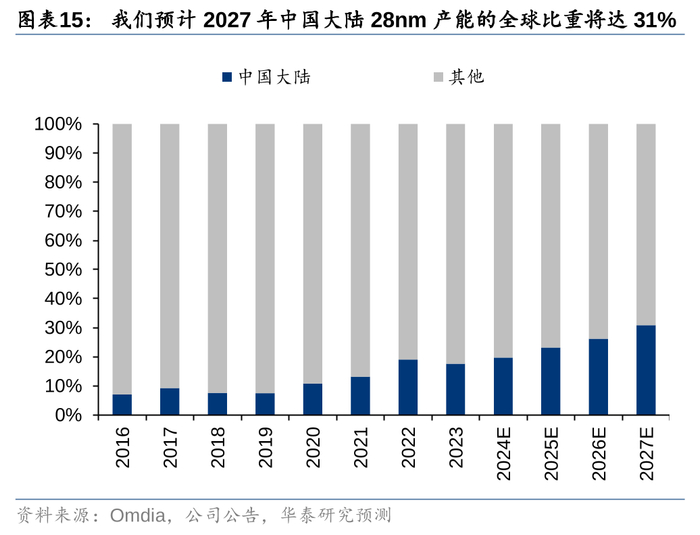 需求端,对于广泛的成熟制程芯片,若不追求极致的性能和功耗,我们认为28/22nm节点相对16/14/12nm(采用FinFET结构)具备良好的经济效益和性价比。诸如OLED显示驱动、中低端处理器、ISP、Flash、WiFi-6等产品升级为28nm需求增长的重要动力,且可能中长期大量在28/22nm平台进行生产。此外,我们认为车规/工业等高端MCU、超高像素CIS可能后续也会逐步升级到28nm节点,推动22/28nm结构性成长。我们预计2024-2027年全球28nm晶圆需求将保持12.7%的CAGR增长。供给端,由于28nm节点相对研发难度较大且衍生平台众多,此前台积电、联电等全球龙头主导该节点的发展,中国大陆企业起步相对较晚,目前只有少数企业能够量产。根据Omdia,2023年中国大陆在全球的28nm节点份额仅为18%,未来中芯国际、上海华力、晶合集成等企业将积极推动该节点研发和平台多元化。我们预计2023-2027年全球28nm晶圆产能将保持10.1%的CAGR增长,略慢于需求侧成长,2027年中国大陆产能份额将提升至31%。因此,我们预计2024-2027年全球28nm节点稼动率将保持在近90%的相对满载水平。