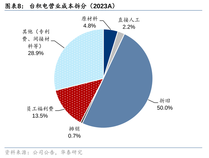 原材料成本海内外差距不大:国内半导体材料国产化率仍较低,和海外代工企业类似,目前国内代工企业主要采购日本、美国等材料。根据观研天下,2022年12 英寸硅片国产化率仅为10%,光刻胶国产化率为10%,电子气体国产化率为15%,湿电子化学品国产化率为10%。因此,我们认为国内和海外代工企业在原材料端的成本差异不大。