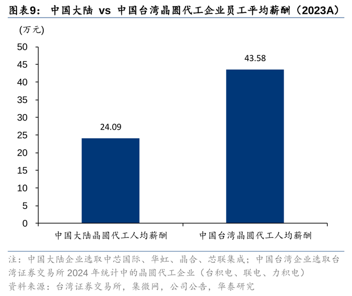人工成本为中国大陆企业重要优势:根据台湾证券交易所和集微网的统计,2023年中国大陆晶圆代工业的人均薪酬为24.09万元,而中国台湾为43.58万元,较中国大陆高80.9%。若我们仅考虑劳动力成本的差异进行测算,中国大陆晶圆代工企业的成本较中国台湾企业低11.3%。(根据台积电,劳动力成本比重约15.7%)。因此我们可以认为,中国大陆代工企业在相同工艺节点上,相对中国台湾等海外企业将具备11%左右的成本优势。我们认为该成本优势为海内外设计客户选择转单中国大陆企业的重要因素之一。