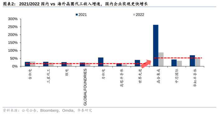 2021年新冠疫情在全球肆虐,一方面导致全球半导体供应链紊乱,跨国贸易面临挑战;另一方面疫情催生“宅经济”,居家办公、娱乐需求推动智能手机/PC等消费电子行业销量增长。根据IDC,2021年全球智能手机、PC销量分别同比增长5.7%、14.8%。全球芯片行业迎来广泛缺芯涨价的状况,主要海外代工企业产能利用率达到100%,产能供不应求。受制于海外产能供应紧张和地缘政治因素,国内芯片设计企业开始逐步向国内转移产能。中国代工企业经历长时间积累,8英寸和12英寸成熟制程代工平台已能实现较好程度的国产替代能力。因此,把握住行业契机,中国代工企业积极进行产能建设承接国内设计公司订单转移,涵盖LCD Driver、CIS、MCU、WiFi、功率器件、BCD等广泛品类。2021/2022年国内代工企业平均营收同比增速连续两年超过海外主要代工企业(国内125.0/58.2% vs 海外31.6/18.1%),实现市场份额快速提升,并形成和国内客户的深度粘性。