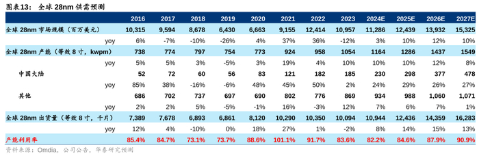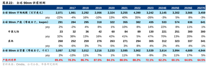 影响#1:全球12寸成熟制程供需结构性分化—28nm满载,但40/55/65/90nm或将过剩