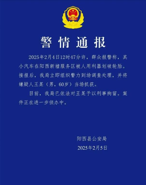 ·广东阳西警方通报:一男子在服务区划破他人汽车轮胎被刑拘。